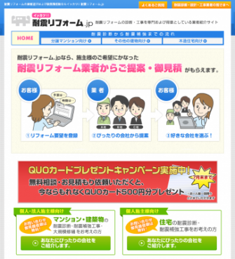本サービスは、個人・法人のお客様からのお問い合わせ(ご要望)をwebサイトで受け付け、耐震診断・耐震補強・耐震工事を専門もしくは得意としている業者様に手を挙げていただくサービスです。