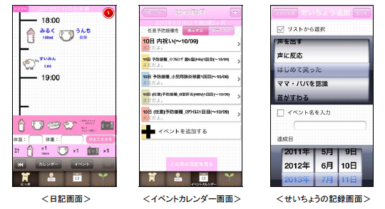 また、以下のような“イベントカレンダー”、“せいちょうの記録”、“写真へのおえかき&アルバム”等の機能により、成長の記録を思い出として残すことができます。