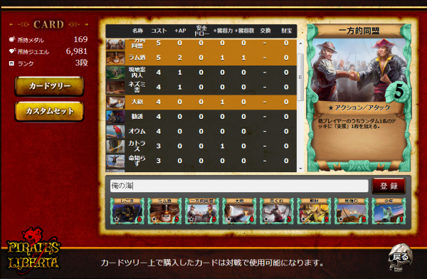 「カスタムセット」によって今までよりもプレイヤー個々の戦術を対戦に持ち込む事ができるようになり、より一層スリリングな対戦を行うことができます。またMYカードセットの面白さを他のユーザーと共有したり、逆に意見を貰ったりすることで個人でオリジナルの『Pirates of Liberta』を作るようなコミュニケーションを楽しむことができます。