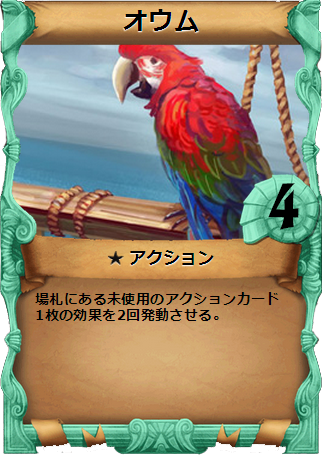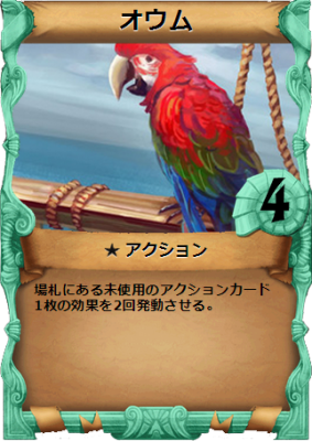 「オウム」は場札にある未使用のアクションカード1枚の効果を2回発動させる効果があります。そのため「オウム」の使用後、任意のアクションカードを使用することで、どのアクションカードでも効果を2回発動させる事ができます。自らのデッキにおいて効果的なカードはオウムと組み合わせて使用することで、より強力な効果を得ることができます。ただし、オウムをドローしさらにオウムを使用するアクションカードに必要な条件を揃える必要があります。そのため安定した効果を発揮するのが難しく、バーストのコントロールが重要なカードとなります。