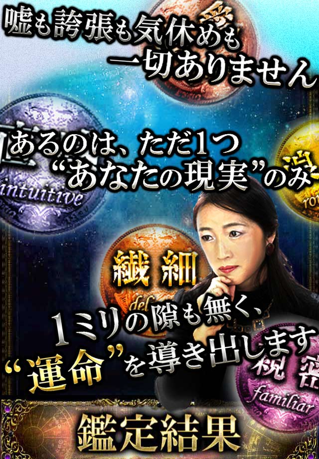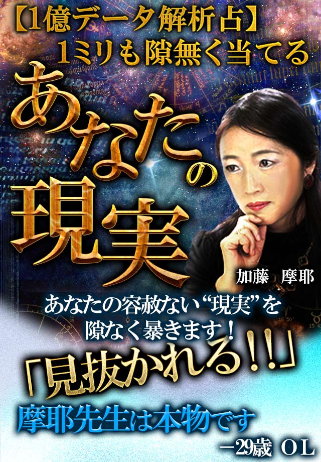 鑑定実績1万人以上。30年にわたる1億データもの占い研究の成果から1ミリの予断も許さぬスーパー精度の分析力であなたの事を占います。わずかな運命の隙まで逃さず語る…当たるを100%に限りなく追及した「あなたの現実」をお聞きください。