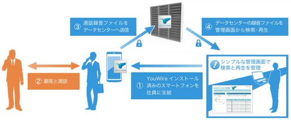 【YouWire VM】は全通話の自動録音機能により、いつ(時間情報)、だれと(電話番号情報)、何を(全通話録音機能)会話したのかというデータをサーバーで一元保存管理するサービスで、SMBユーザーをターゲットにサーバーの保存容量や位置情報、一部管理者機能の異なるエディションを低価格で提供いたします。