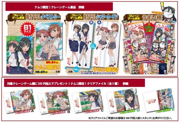 キャンペーン実施店舗では、「描き下ろしタペストリー」(B1サイズ・全2種)や「描き下ろしシャワーカーテン」(150cm×80cmサイズ・全2種)などナムコ限定クレーンゲーム景品が続々登場するほか、キャンペーン実施店舗ご来店のお客様に先着で「『とある魔術の禁書目録 頂点決戦』SRカード」または「『ヴァイスシュヴァルツ とある科学の超電磁砲S』PRカード」(お一人様1日枚限り)をプレゼントいたします。