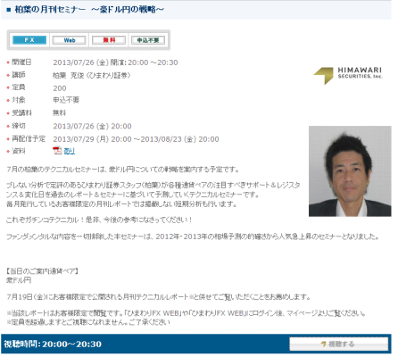 日本で初めてFX取引を提供した「ひまわり証券」は、2013年7月26日(金)20:00から、どなたでも、自由に、無料で、ご覧いただけるFX取引のWEBセミナー「柏葉の月刊セミナー ~豪ドル円の戦略~」を放送いたします。