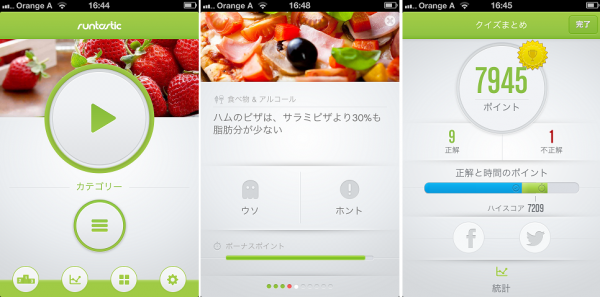 「Runtastic 栄養管理クイズ」は、「チーズは、より早く眠りにつくお手伝いをする」「茶色い殻の卵は、白い殻の卵より栄養価が高い」等の質問に、「ウソ」あるいは「ホント」のボタンをクリックすると、質問の正誤とともに日常生活に応用可能なアドバイスが表示されるアプリです。1回のセッションごとに全11カテゴリー(※2)の中から10問を出題。セッション後は、正解数と解答に要した時間それぞれの得点が合計され、自分のアカウントに加算されます。また、フェイスブックやツイッターでのシェア、世界のランタスティックユーザーと自分のランキングの比較も可能、クイズ・ゲーム感覚で食事やダイエットについて改めて学び、日々の身体づくりに役立てることができるアプリです。