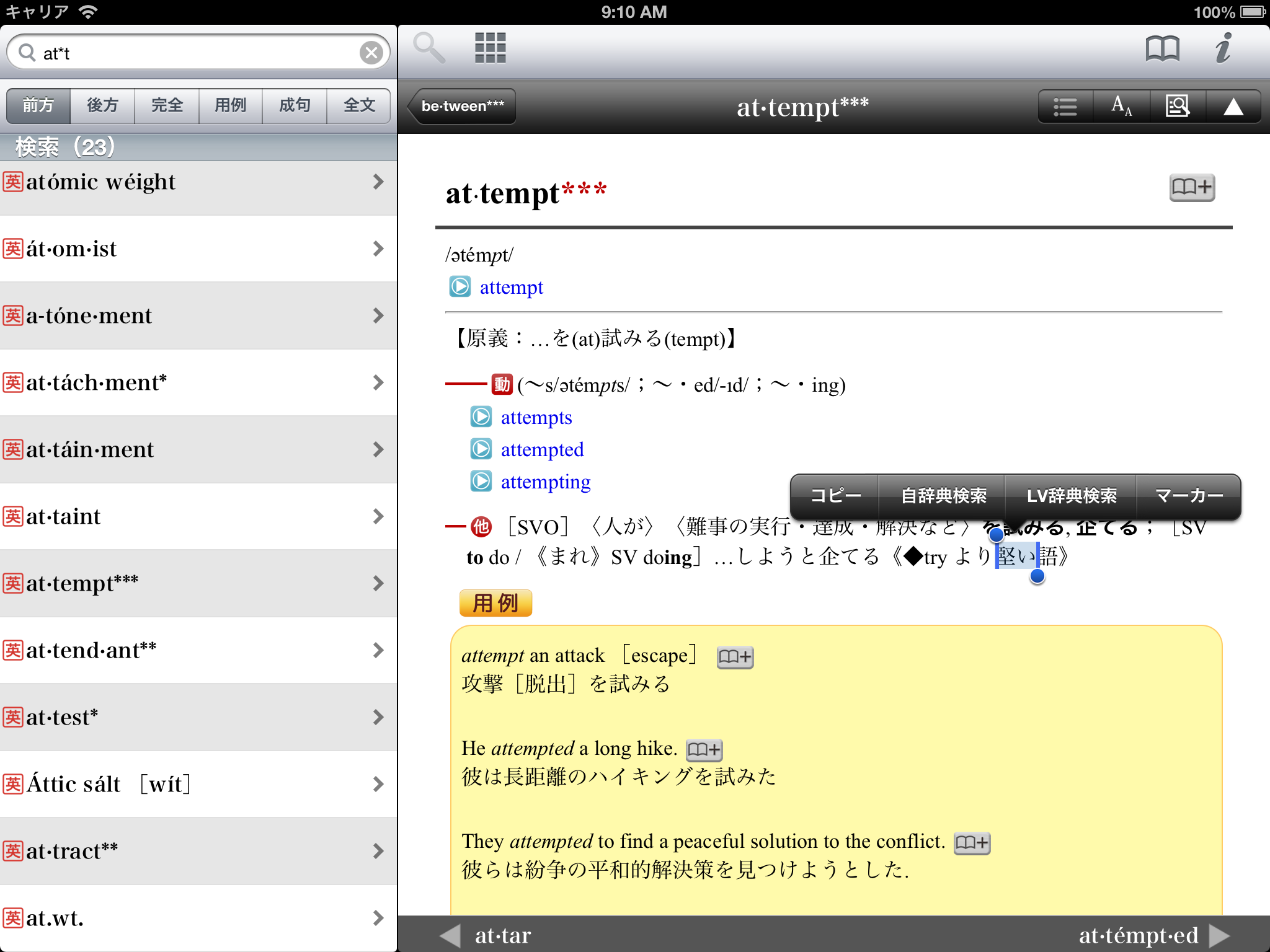 LogoVista電子辞典で培った検索方法を継承。前方一致/後方一致/完全一致/部分一致/全文検索といった豊富な検索オプションを利用できます。また文字を入力すると候補見出し語が表示され、うろ覚えでも検索できるインクリメンタルサーチや、検索結果に表示された本文中の用語をなぞることでそのまま連続辞書引きも可能。思考を妨げることなく次々と検索できるのが特長です。マルチタッチによる拡大やセンサーによる画面の回転にも対応しています。