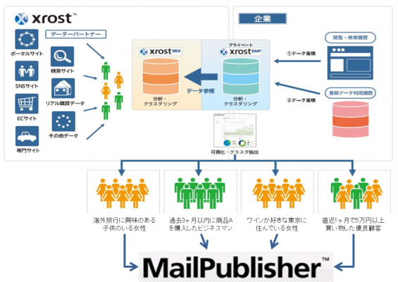今回、先鋭的なクラスタリング技術に強みを持つ Xrost DMP と、メール配信技術に強みを持つMailPublisher Smart が、その独自の専門技術をシームレスに融合させることで、クラスタごとに最適なパーソナライズメールの配信を実現します。また、メール配信に限らず、XrostDMP の連携ソリューションの中からクラスタごとに最適なコミュニケーションチャネル(メール、広告、コンテンツ等)が選択可能です。