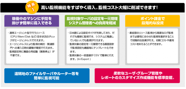 ●エージェント(監視プログラム)を監視対象の機器内へ置かない「エージェントレス型の監視方式」により、サーバー、ネットワーク機器等をリモート監視することが可能で、監視に関わるコストと業務、時間のロスを削減して、監視の効率化とシステムの安定稼働を推進することができます。