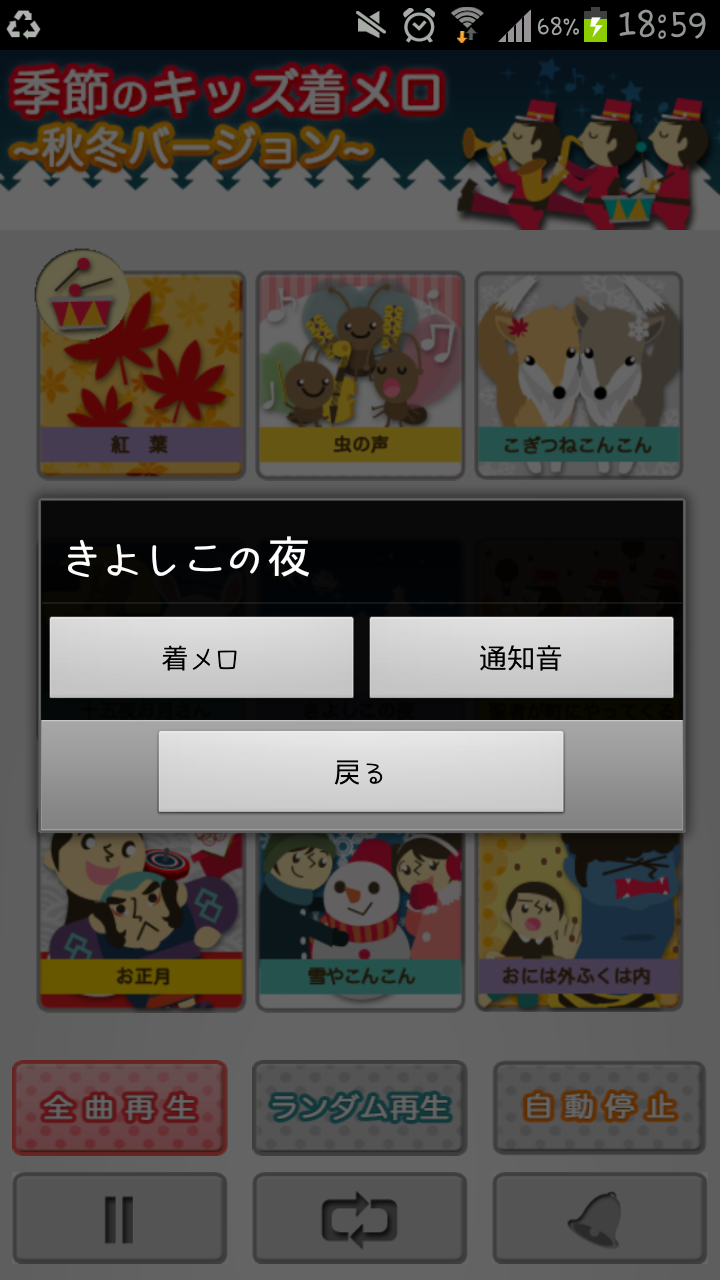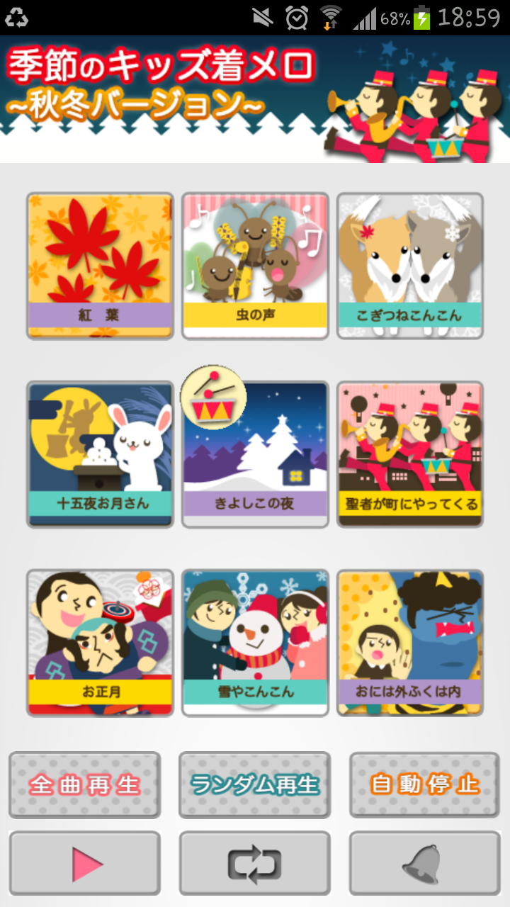 「季節のキッズ着メロ~秋冬Ver~」は、Android端末にて子供向けの童謡を再生できるアプリケーションです。秋~冬の季節にぴったりの童謡定番曲を、高音質の着メロを収録しています。