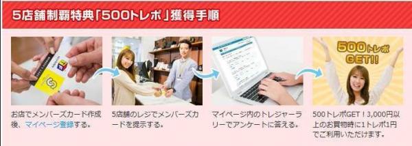 トレジャー・ファクトリーが発行している入会費・年会費無料のメンバーズカードを活用した、カード会員向けのキャンペーンです。キャンペーン期間内にカードをお持ちになり、トレジャーファクトリー&トレジャーファクトリースタイルの店舗5店舗をまわってアンケートにお答えいただくと、トレジャーファクトリー、トレジャーファクトリースタイル全店で(※1)使用できるポイントを「500トレポ」(※2)をプレゼントいたします。