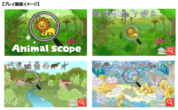 最新作の本アプリは、一見何もいない風景に“虫めがね”を使い、隠れた動物たちを見つけることで「探究心」や「認識力」を育てる知育ゲームアプリです。山、海、ジャングルの3ステージを用意し、各々に子どもの大好きな「ライオン」や「イルカ」等の動物が隠れており、虫めがねを指でドラッグしながら隠れている動物を全て見つけるとステージクリアとなります。