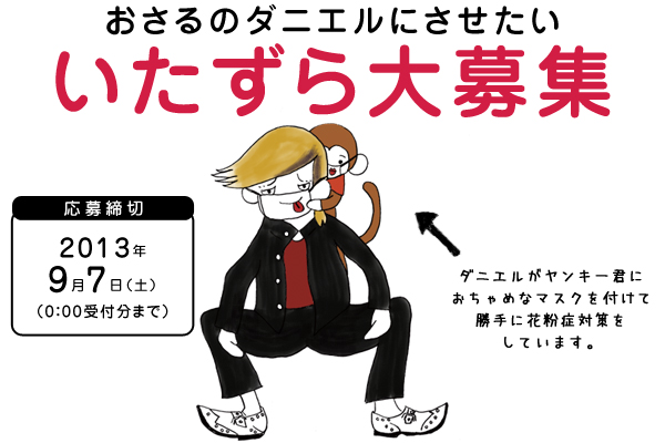 ダニエルにさせたいイタズラを400文字以内の文章で書いて、下記の応募サイトから応募して下さい。