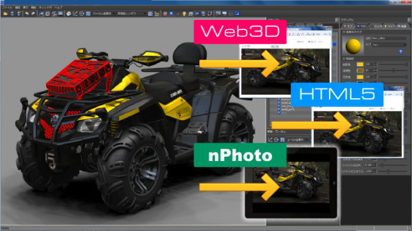nStylerでレンダリングしたデータは、Internet Explorerに対応した高品位なWeb3D表示として利用する事が可能です。また、Internet Explorerやchrome等の各種ブラウザで360度の回転コンテンツとして表示する事が出来るHTML5に準拠した「nView360」を新機能としてサポートしました。また、Android、iPhone、iPad2等のデバイスを利用してARの様な空間配置が行える「nPhoto」への出力も行えます。