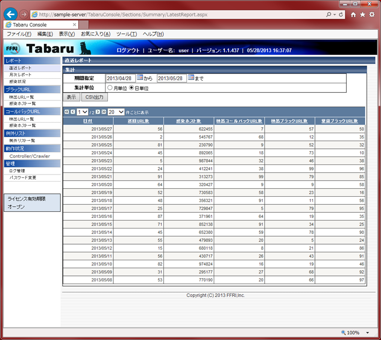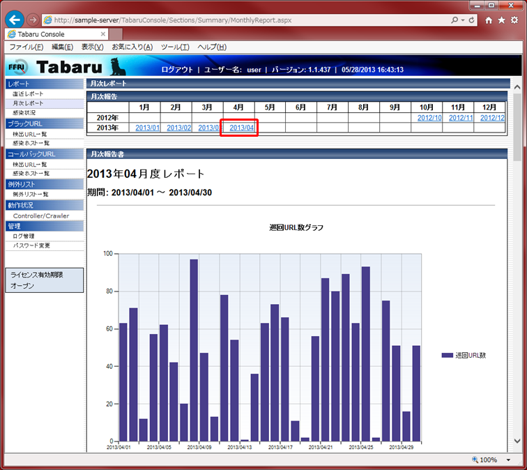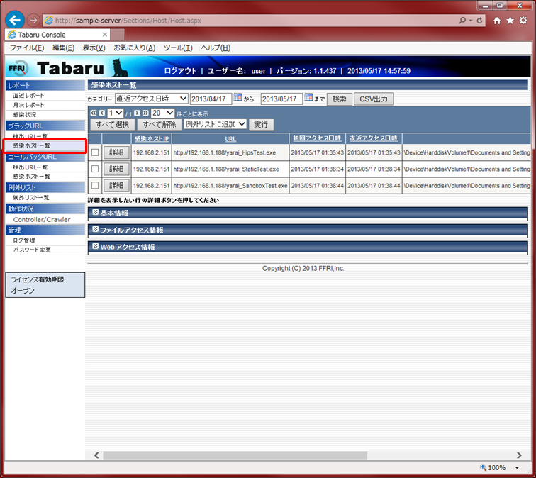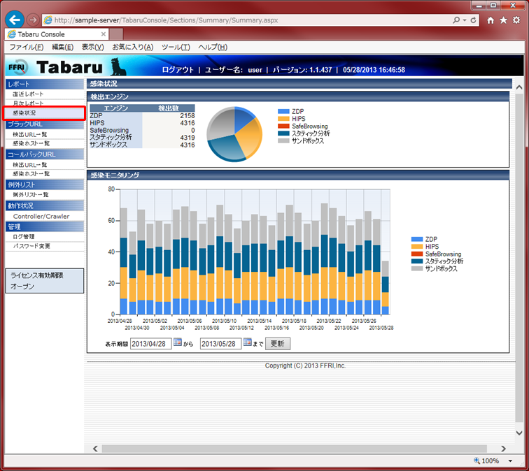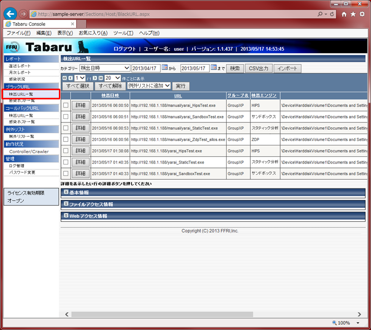 FFR tabaruは、こうしたWeb経由のサイバー攻撃を可視化し、防御することが可能なゲートウェイ型の標的型攻撃対策製品です。具体的には、Webゲートウェイ上に仮想化技術を利用したサンドボックスを用意し、サンドボックス上でユーザーがアクセスしたWebサイトを同じように閲覧することで、脆弱性攻撃やマルウェア感染の影響がないかを静的/動的に分析します。脆弱性攻撃やマルウェアの検出には、エンドポイント型の標的型攻撃対策製品として官公庁や重要インフラ企業などで多くの導入実績があるFFR yaraiのヒューリスティック検出エンジンが搭載されており、未知のサイバー脅威を高精度に検出します。悪性と判定したURLについては、Proxyサーバと連携することでアクセスを遮断することが可能です。また、組織内部のユーザーが閲覧したWebサイトのチェックだけでなく、あらかじめ指定したWebサイトの巡回機能もあり、Webサイト改ざんにより、マルウェアや不正なスクリプトが仕込まれていないかを巡回検査することも可能です。