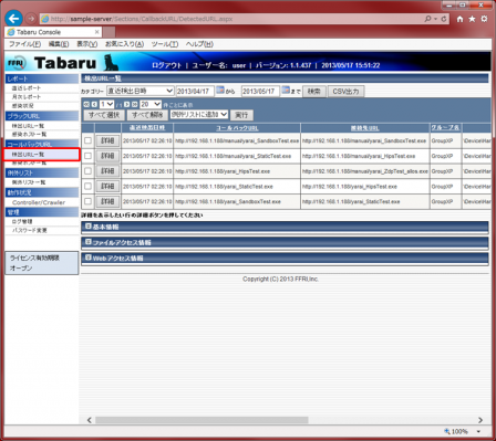 FFR tabaruは、こうしたWeb経由のサイバー攻撃を可視化し、防御することが可能なゲートウェイ型の標的型攻撃対策製品です。具体的には、Webゲートウェイ上に仮想化技術を利用したサンドボックスを用意し、サンドボックス上でユーザーがアクセスしたWebサイトを同じように閲覧することで、脆弱性攻撃やマルウェア感染の影響がないかを静的/動的に分析します。脆弱性攻撃やマルウェアの検出には、エンドポイント型の標的型攻撃対策製品として官公庁や重要インフラ企業などで多くの導入実績があるFFR yaraiのヒューリスティック検出エンジンが搭載されており、未知のサイバー脅威を高精度に検出します。悪性と判定したURLについては、Proxyサーバと連携することでアクセスを遮断することが可能です。また、組織内部のユーザーが閲覧したWebサイトのチェックだけでなく、あらかじめ指定したWebサイトの巡回機能もあり、Webサイト改ざんにより、マルウェアや不正なスクリプトが仕込まれていないかを巡回検査することも可能です。
