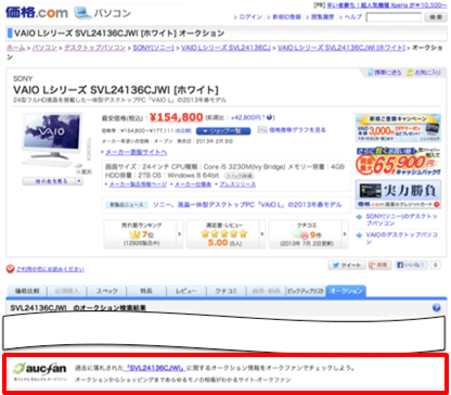 一方、「価格.comカカクコム」は、サイト上の各製品ページにおいて、ECサイトの価格比較サービス・レビュー・クチコミ情報を提供しており、オークション比較コンテンツも保有しておりますが、これまでそこでは、「ヤフオク!」、「楽天オークション」の過去に落札された商品情報は掲載されていませんでした。