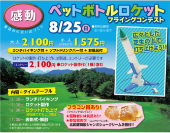 これはペットボトルを使ってロケットを各自製作し、広々としたゴルフ場の芝生の上で爽快にフライングコンテストをやろうというもので、参加費は<ランチバイキング付き+ソフトドリンクバー付き+お風呂付き>で大人2,100円、小学生以下1,575円。ほかにロケットの製作・打ち上げには別途1エントリーに付き2,100円(ロケット製作代:1機含む)が必要となります。