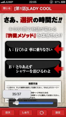 第1回の選択は以下の2択。「A:行くわよ 車に乗りなさい」「B:とりあえずシャワーを浴びるわよ」。どちらの投票が多かったのか、投票結果を受けて作者がどんな続きのストーリーを描いたか、「ジャンプLIVE」の『LADY COOL』第2話でお楽しみください。