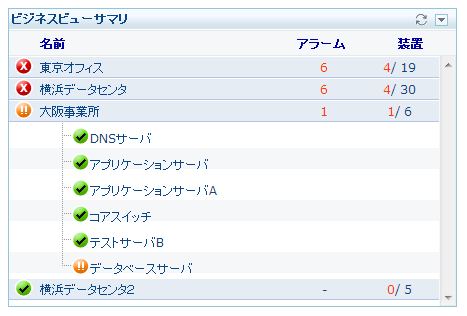 「ダッシュボード」では、ネットワークやサーバのステータスを視覚化したあらゆるウィジェットを、ニーズに合わせて自由に組み合わせられます。さまざまな情報を一画面で確認でき、平常時または障害発生時の迅速な状況把握を支援します。リリース10.2では、ビジネスビューに登録されている装置をツリー構造で表示する機能など、数種類のウィジェットを強化しています。