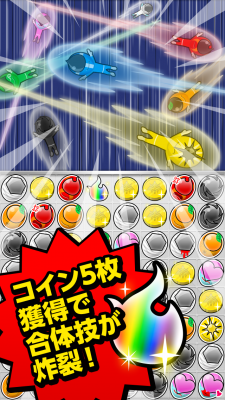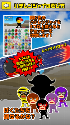 ゲーム内容は同じ色のハチレンジャイ(ブロック)を上下左右に動かして、3個以上揃えて消していきます。この同時消しを4個消すと「必殺技」、5個消すと「奥義」が発動し、ド派手なアクションで画面上部のチョッカー(敵)にダメージを与えて倒していきます。