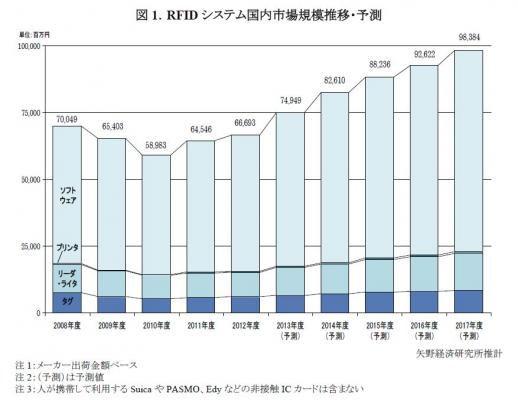RFID(Radio Frequency IDentification)システムとは、RFIDタグ(ICタグ)の電子回路に記憶された情報を、無線通信によって、非接触で読み書きする自動認識システムを指す。人が携帯して利用するSuicaやPASMO、Edyなどの非接触ICカードも、RFIDと同様の技術で広義のRFIDの一種に含まれるが、本調査では対象に含まない。