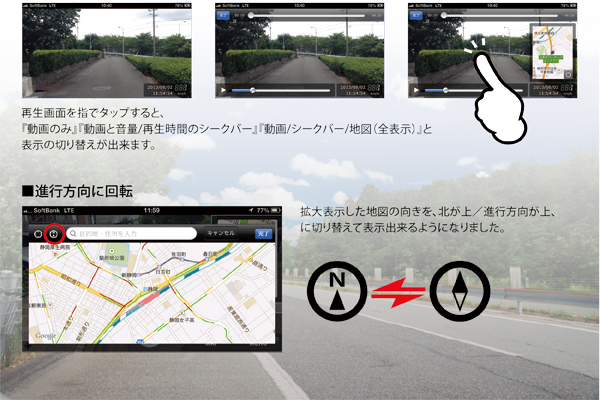 走行時の日時、経路、速度を記録し、日時と速度は動画再生時にリアルタイム表示され、経路は地図上にルート表示されます。動画にあわせて表示される日時と速度は事故の重要な証拠となりえます。動画は日時と速度を付けたままカメラロールに保存ができ、そこからPCへ保存したりYoutube等にアップして共有することもできます。