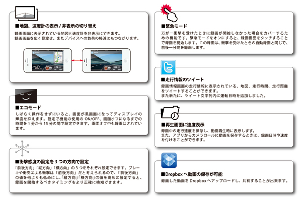 ドライブレコーダーとしての基本機能のほかにも、iPhoneの能力を活かした多彩な機能を搭載しています。3つの画質選択(最高・高・中・低)、ツイッターのタイムライン表示(録画画面上部に1ツイートずつテロップ表示)、静止画撮影(録画中にカメラボタンを押すと写真を撮影)、簡易ナビ機能(現在地から目的までの経路を地図に表示)などを搭載し、基本機能による安全や安心はもちろん、これら様々な機能によってドライブに楽しみと利便性を提供します。