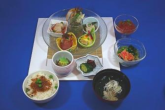 内容:・房総きんそう鶏冷麺 ・白アスパラ豆腐 ・枝豆信田巻き ・マグロ生ハム野菜巻き ・太刀魚唐黍焼き ・豆カワハギの唐揚げ ・冷やし鉢茶うどん ・ちりめん山椒ご飯 ・香物 ・お椀 ・デザート