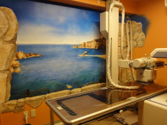 閉鎖的で怖いイメージが強いX線室には、イタリアのタオルミーナの絵画で、開放的で楽しい空間にしました。