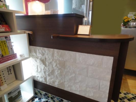 受付カウンターは形状・素材だけでなく、高さや距離感など細かな調整を行いました。ダークな色合いと素材感のある石が空間を引き締めます。