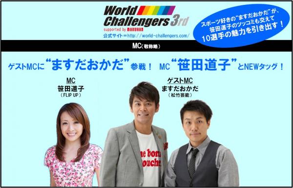 この度、『第3回マルハンWorld Challengers』では、協賛金¥1000万円をめぐって、書類審査通過者10名のプレゼンテーションによる争奪戦が行われます。書類審査通過者10名の個性を引き出すゲストMCとして“ますだおかだ(松竹芸能)” が決定致しました。
