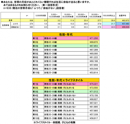 さらに性・年代×ライフスタイルのランキングで見ると、男性40-44歳・未婚・子無しの層がトップとなり、「月75,221円」と全体平均よりも1万2千円以上希望金額が高い結果となりました。