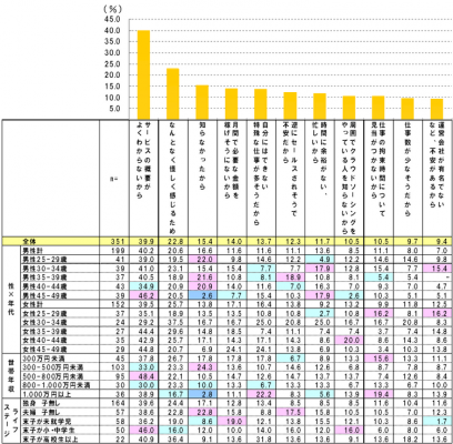 全体で見たクラウドソーシングを使わない理由のトップは、「サービスの概要がよくわからないから」が約4割でした。上位に「なんとなく怪しく感じるため」「知らなかったから」など【クラウドソーシング自体がわからない】という理由が多いことから、サービスが一般的に浸透していないため不審に思う人が多いことがうかがえます。