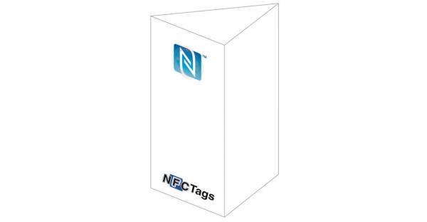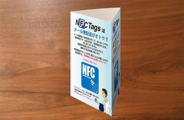 NFC-卓上スタンドPOPは、NFCタグを貼付した店頭ディスプレー用の三角POPです。NFC-卓上スタンドPOPにNFC対応スマートフォンをかざして動画、クーポンの配信やキャンペーンサイトへの誘導を行うことができます。