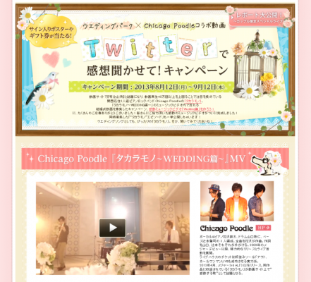 <キャンペーン概要>動画サイトで『号泣必須』と話題になり、動画再生40万回以上を上回ることで注目を集めている関西在住3人組ピアノロックバンドChicago Poodleの「タカラモノ」。ウエディングパークでのキャンペーンで募集し、新郎新婦と共同作成した「タカラモノ~ウエディング篇~」のMV(ミュージックビデオ)の感想をツイートして下さい。抽選でChicago Poodleのサイン入りポスターや、Amazonギフト券(1,000円分)をプレゼント!キャンペーン期間:2013年8月12日(月)~9月12日(木)