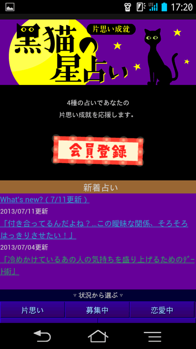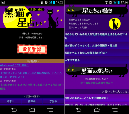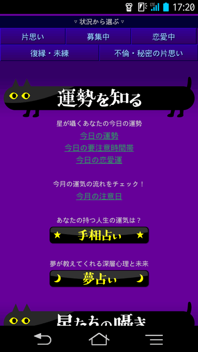 「片思い成就★黒猫の星占い」は、黒猫ルルのナビゲートで、日々の運勢や恋愛運、またオリジナル占いを手軽に楽しめる占いサイトとして2005年4月にau公式コンテンツとしてリリースされました。