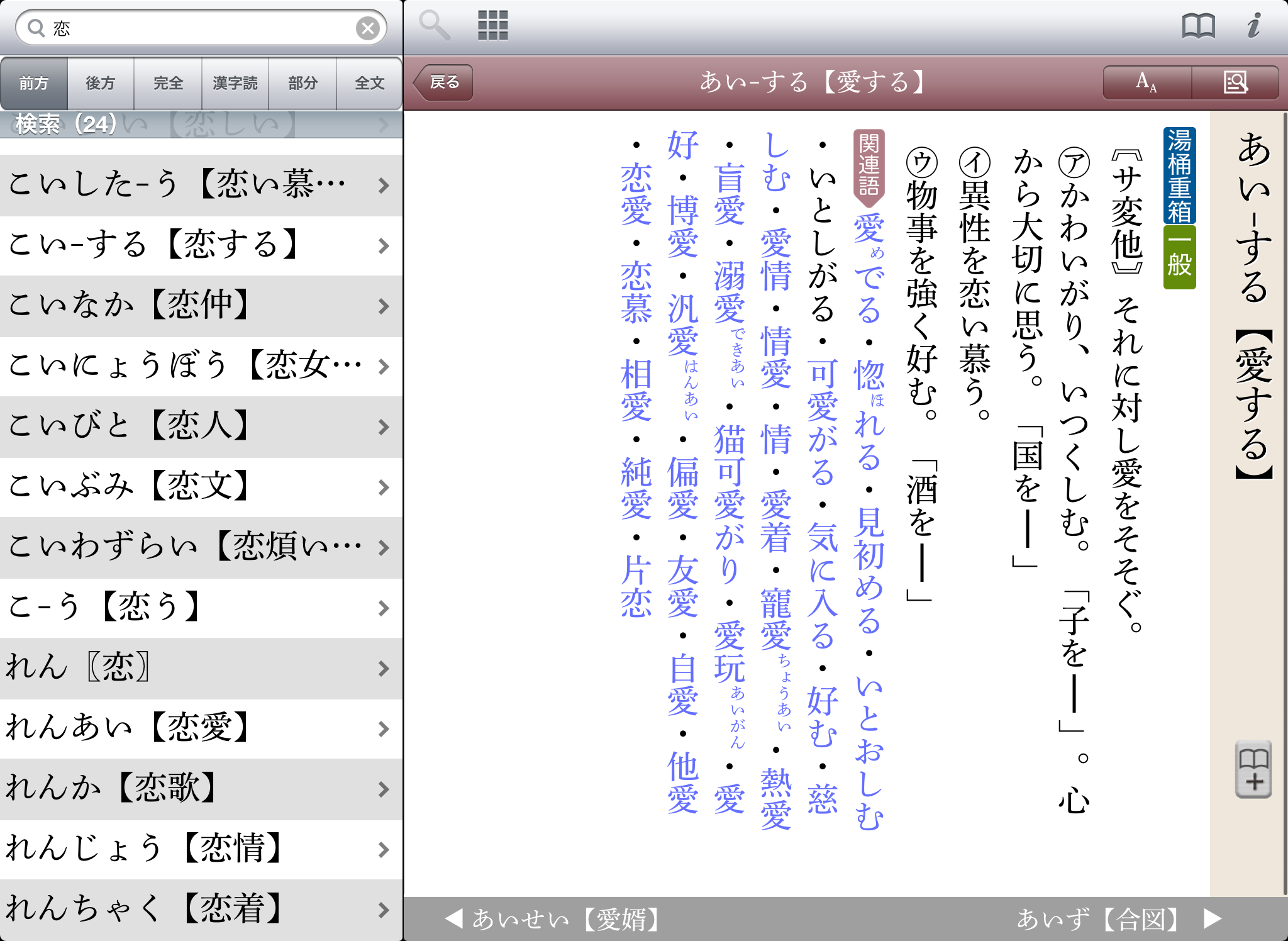 ●豊富な検索オプションを用意(前方一致検索・後方一致検索・完全一致検索・漢字読検索・部分一致・全文検索)。それぞれの検索方法で、文字を入力すると候補見出し語が表示されるインクリメンタルサーチに対応。(部分一致、全文検索を除く)用語をうろ覚えでも検索が容易です。