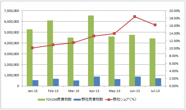 TOCOMの月間総売買枚数と弊社売買枚数・シェアの推移