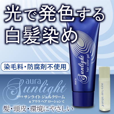 アウラ サンライト「aura Sunlight」ジェルクリームなら、髪をコーティングし、そのコーティングそのものが光によって発色する、髪・頭皮・環境にやさしい、まったく新しい白髪ケアです。
