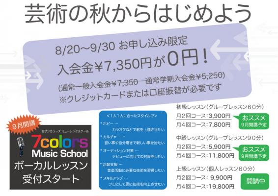 株式会社テイクセブン (本社:大阪府大阪市、代表:熊田 晃典)の運営するスクールブランド「7colors Music School」(セブンカラーズ・ミュージックスクール)が芸術の秋に向けて初心者・中級者向けレッスンを新たにスタート!入学金無料キャンペーンを期間限定で実施する。初級レッスンは驚きの月3,900円/月2回!