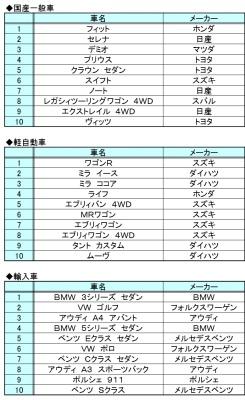 ワゴンR(スズキ)、ミラ(ダイハツ)、ライフ(ホンダ)は引き続き上位にランクイン。