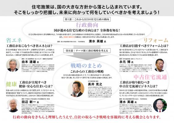 セミナーは2部構成とし、第I部には住宅行政の動向や全体像について解説します。第II部は省エネ、健康、リフォーム、中古流通の各テーマについて、それぞれの専門の先生方に説明していただくと同時に、パネルディスカッション形式にて会場からの質問・疑問点にもお答えいただく形としております。最後に、住宅産業塾 塾長 長井克之より、今後の工務店の戦略について提言いたします。