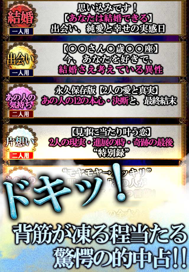 恋人の気持ちがわからない時、仕事の壁にぶつかった時、人生の決断に迷った時……その他、必要な時に、どうぞこのアプリを役立てていただければ幸いです。数々のアプリがある中で、こちらへいらしてくださった皆様とは、奇跡のご縁があるのかもしれません。何事も必然。皆様のお幸せと開運を心よりお祈り申し上げます。