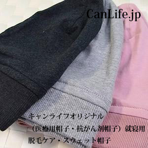 抗がん剤副作用による脱毛は通常の脱毛と違い、薬によって短期間で脱毛するため、頭皮が敏感になり脱毛途中に痛みを伴うこともあり、痛みや不快感の軽減のために、特に就寝時や室内安静時にかぶる目的で作られた帽子を総称して「医療用帽子」または「抗がん剤帽子」とよんでいます。