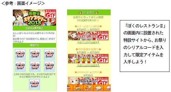 株式会社enish(本社:東京都渋谷区、代表取締役社長:杉山 全功、以下「エニッシュ」)が提供するソーシャルゲーム『ぼくのレストランII』は、ヒーローズエデュテイメント株式会社(本社:東京都千代田区、代表取締役会長兼社長:秋沢 志篤)が「お祭りやイベントで東京圏を活性化することを目的に」主催するGTFグレーター トウキョウ フェスティバル(以下「GTF」)とコラボし、東京圏内で実施される4つのお祭りと連動したO2O(※)キャンペーンを実施します。