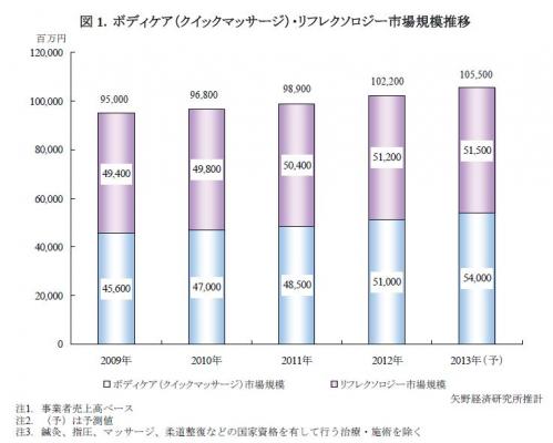 ◆ 2013年のボディケア(クイックマッサージ)・リフレクソロジー市場規模は前年比103.2%の1,055億円を予測