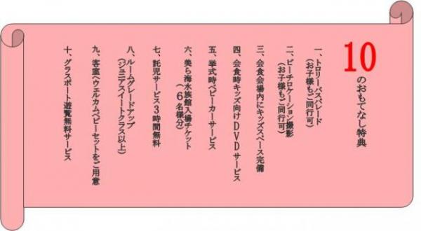 沖縄唯一の「ウェルカムベビーの結婚式場」として、新郎新婦はもとより、参加者の方々へも安心して式を行って頂ける式場としてミキハウス子育て総研より認定頂き、さらに、新郎新婦お子様連れの式を挙げる場合は、よりご満足頂けるよう特典をご用意致しました。