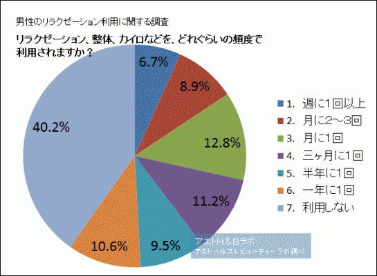 運営するネット通販「アエトH&Bラボ」にて、2013年6月12日(水)~7月11日(木)の1ヶ月間(20才以上の男性の方 有効回答数179名)アエト ヘルス&ビューティラボ「リラクゼーション利用に関する調査」を行い、8月27日その結果を発表いたします。