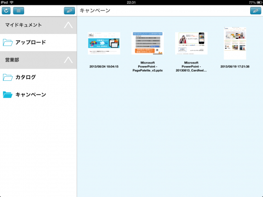 グループに対して編集権限があるユーザーは、管理者に依頼したり管理画面を開くことなく資料をグループ内に配布できます。操作はiPadアプリで資料をグループのフォルダにコピーするだけです。