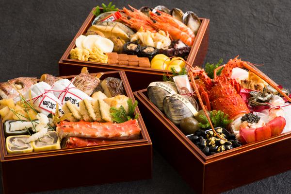 伊達巻、栗きんとんなどの定番に加え、伊勢海老、タラバ蟹、雲丹やあわびなどの贅沢な海の幸、日本の三大珍味である雲丹、このわた、からすみ、さらに世界三大珍味のキャビア、フォアグラ、トリュフも楽しめる豪華な和風の三段重です。鮮度と美味しさを最大限に引き出す調理法、味、魅せ方にこだわり抜き、職人が丁寧に盛りつけました。